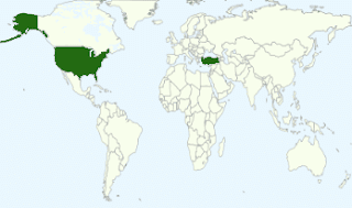 Şu hemen yandaki görsel, böyle programlardan birinin mekana yerleşimini gösteriyor. Bedava programı kullanan kişi benim; mekanım Türkiye. Koyu yeşille belli… Kuzey Amerika’nın iki parçası da aynı yeşil renge boyalı. Kullandığım internet programının yaratıcı ve yöneticilerinin ülkesi burası. Büyük parça Amerika Birleşik Devletleri, küçük parça da bu devletin Alaska Eyaleti… Kişisel olarak bu mekanlarla hiçbir bağım yok. Bu programı kullandığım için kendilerinden izin almam gerekmedi; herhangi bir ödeme yapmam gerekmedi; yazılarımı yerleştiriyorum ve okuyucularımla buluşuyorum.