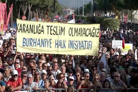 Mitingde vatandaşlar, “Havama, suyuma, toprağıma dokunma”, “Zeytine uzanan eller kırılsın”, “Hak, hukuk, adalet”, “Kurtuluş yok tek başına ya hep beraber ya hiçbirimiz”, “Hükümet istifa” ve “Birleşe birleşe kazanacağız” sloganları atarak, doğa ve çevre talanına tepkilerini dile getirdi.